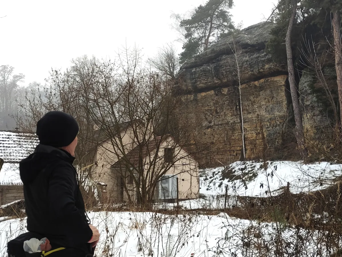 18. ledna 2026. Mělnicko. Z Chloumku u Mělníka do Lhotky a na Holý vrch. Led, mlha, sníh. Nádherné terény. Na Kokořínsku nešlápnete vedle.